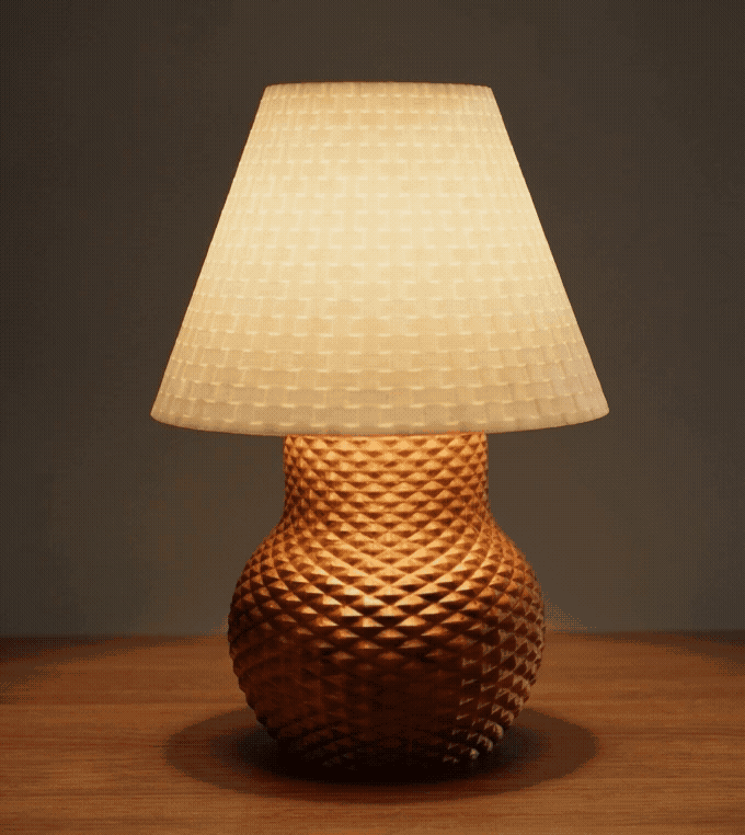 Abajur açıldığı anda, üst başlığın sepet örgüsü dokusundan süzülen ışık ile alt gövdenin bakır tonlarındaki elmas desenleri arasındaki görsel uyum ortaya çıkar. Ürün kendi ekseni etrafında dönerken, ışığın metalik ve dokulu yüzeyler üzerindeki yansımaları ile klasik silüetin mekana kattığı seçkin hava her açıdan vurgulanır.