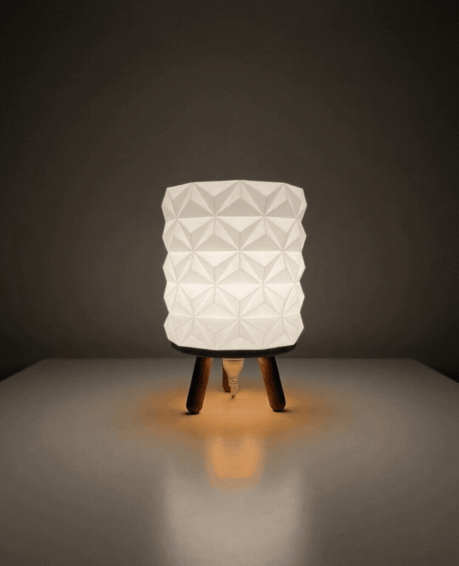 Abajur açıldığı anda, geometrik desenlerin arasından süzülen ışık başlığın üç boyutlu yapısını vurgular. Ürün kendi ekseni etrafında dönerken, ışığın tripod ayaklar ve desenli yüzey üzerindeki dinamik gölge oyunları mekana kattığı modern ambiyansı sergiler.