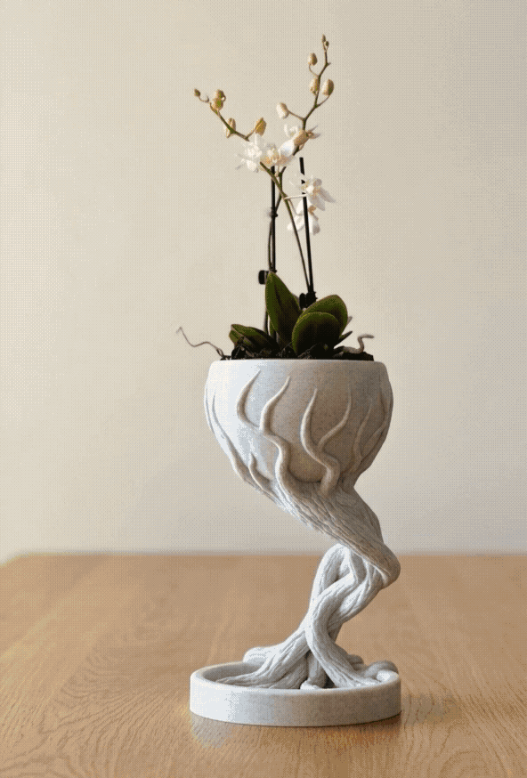 Rooted Elegance ,Doğanın büyüleyici döngüsünü iç mekanlara taşıyan Rooted Elegance, köklerin zeminden yükselerek bir gövdeye dönüşmesini simgeleyen eşsiz bir tasarıma sahiptir. Akıcı ve organik form çizgileri, saksı haznesini yukarıya taşıyarak bitkilerinize dikey bir estetik kazandırır. Bu tasarım anlayışı, özellikle orkide gibi narin çiçekler veya minyatür bitkiler için ideal bir sergileme alanı sunar.