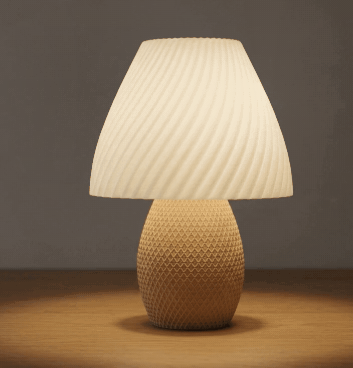 Abajur aktive edildiği anda, spiral gövde yapısı ve dikey çizgili başlık üzerinden süzülen ışık, tasarımın mimari derinliğini ortaya çıkarır. Ürün yavaşça dönerken, ışığın dalgalı yüzeylerde yarattığı yumuşak geçişler ve modern silüetin mekana kattığı seçkin hava her açıdan sergilenir.