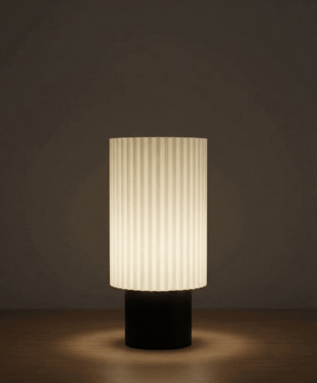 Abajur aktive edildiği anda, dikey oluklu yüzeyden süzülen ışık gövdenin modern dokusunu ve siyah kaidenin yarattığı kontrastı netleştirir. Ürün kendi ekseni etrafında dönerken, ışığın çizgiler üzerindeki akışkan hareketi ve minimalist formun mekana kattığı seçkin hava her açıdan sergilenir.